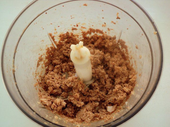 Половину ветчины и поджаренной печени измельчить в блендере.