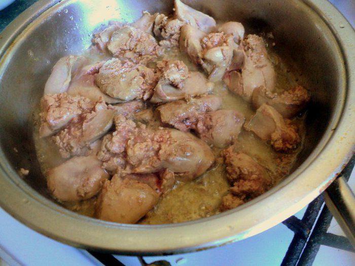 Печень порезать кусочками и поджарить на растительном масле.