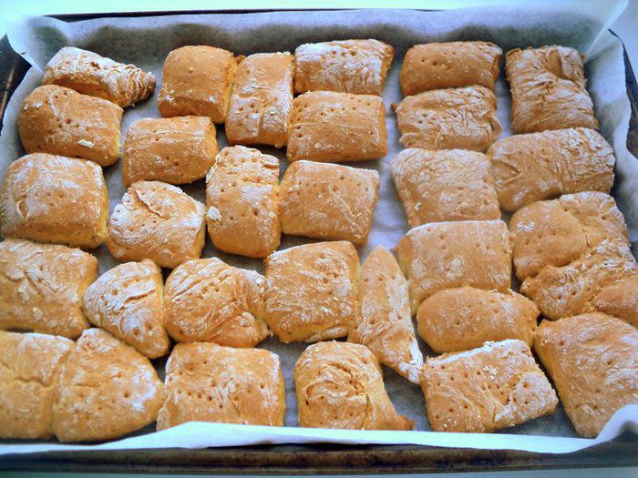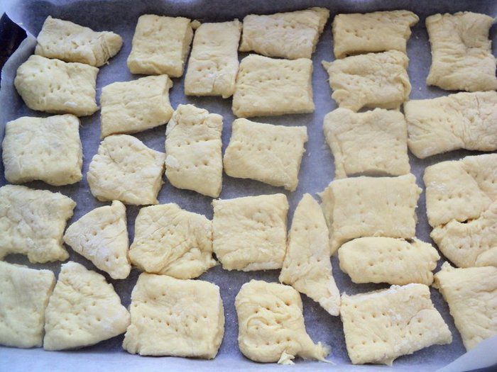 Раскатать тесто в пласт толщиной в палец и разрезать на квадраты. Выложить на противень, наколоть вилкой.