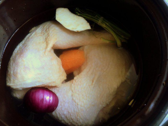 Куриные бедра отварить до готовности с кореньями и луком. Охладить, снять мясо с кости.