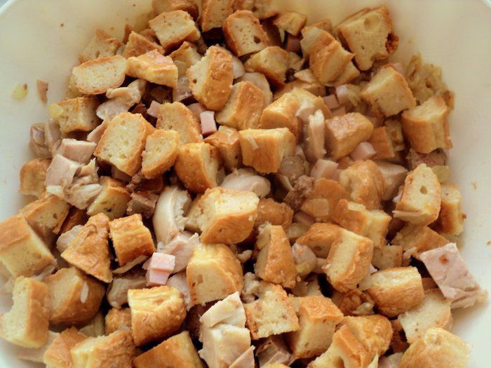Порезать коржики на кубики размером 1.5х1.5 см. Сложить в миску и залить 1.5 чашками куриного бульона. Добавить поджаренный лук, кусочки куриного мяса и печени, хорошо перемешать.