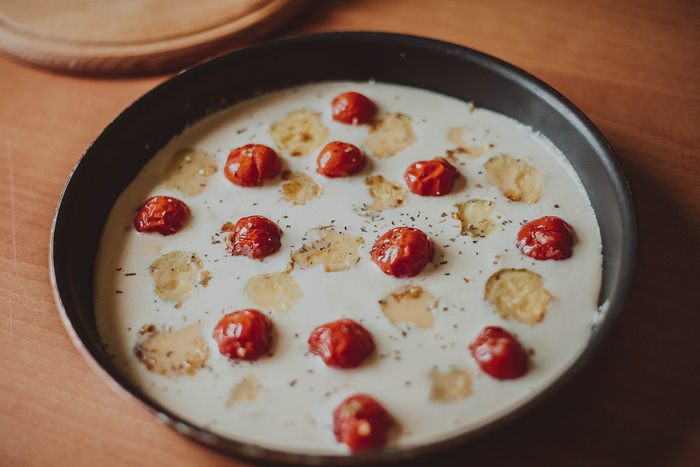Смесь вылить на сковороду,сверху положить черри и готовить в течение 2-3 минут. Затем сковороду переставить в духовку и запекать до готовности. Вынуть из духовки и украсить пармезаном.