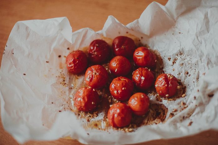 Томаты посыпать измельченным чесноком.сбрызнуть маслом. Посолить и поперчить.Посыпать орегано, перемешать руками и запечь в духовке в течение 15 минут.