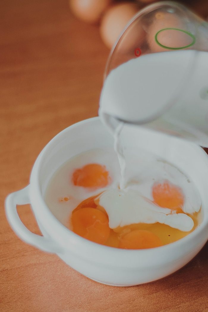 Отдельно взбейте вместе яйца, половина на половину молочную смесь, растопленное масло с оливковым маслом.