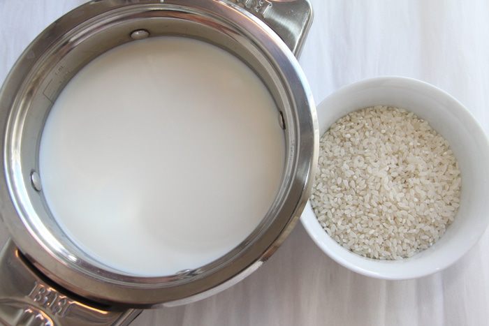 Довести до кипения 800 г молока, добавить рис и варить 20-25 минут, помешивая.