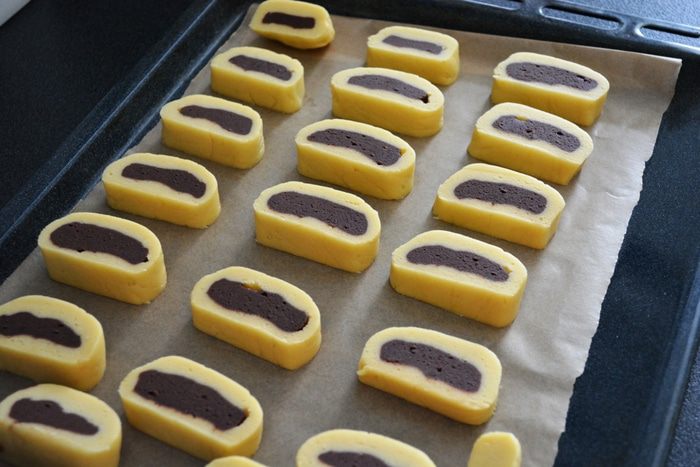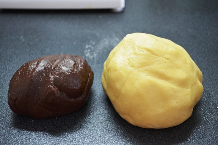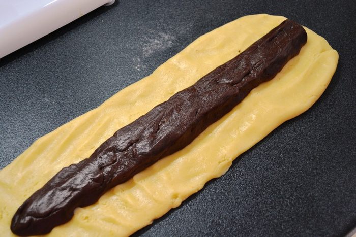 Из бОльшей части раскатываем прямоугольник, посередине формируем узкий прямоугольник из темного теста.