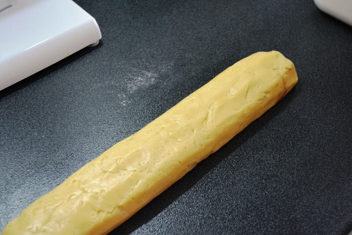 Достаем тесто и нарезаем ломтиками толщиной 1,5-2 см.