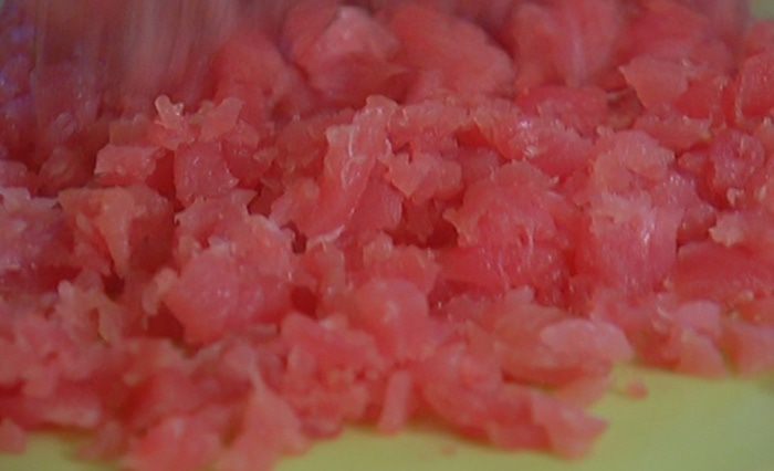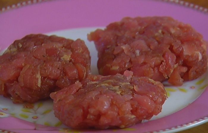 Сформировать из фарша небольшие котлетки и отправить их на несколько минут в морозилку.