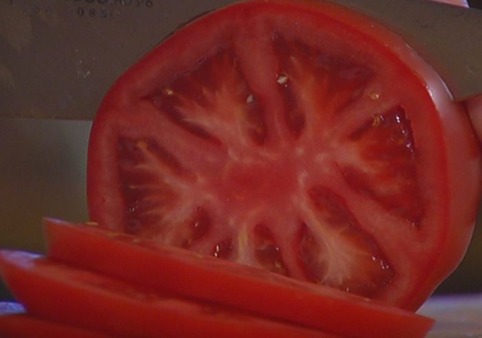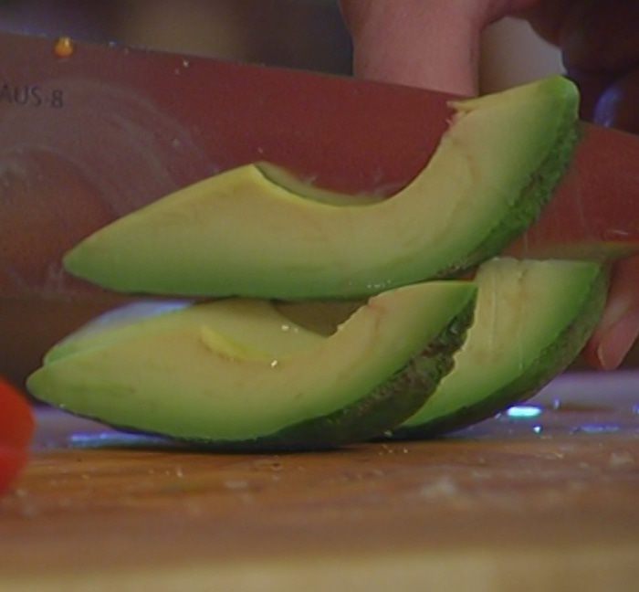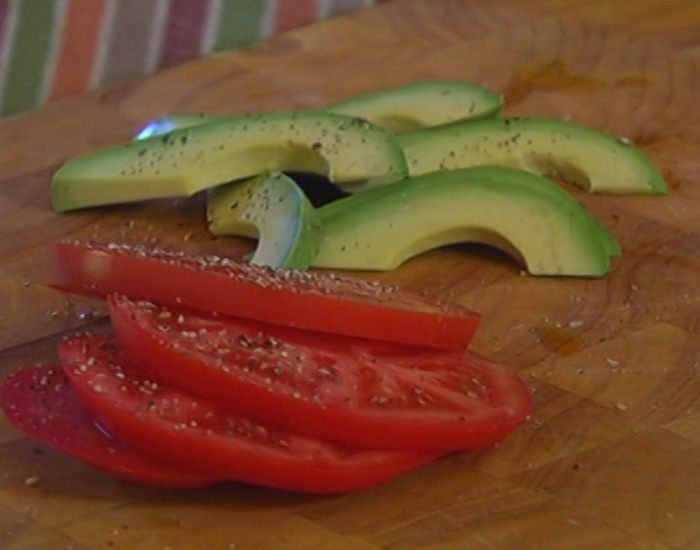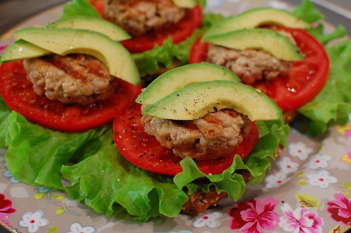 На каждую половинку булочки выложить лист салата, кружок помидора, котлетку и пару кусочков авокадо.