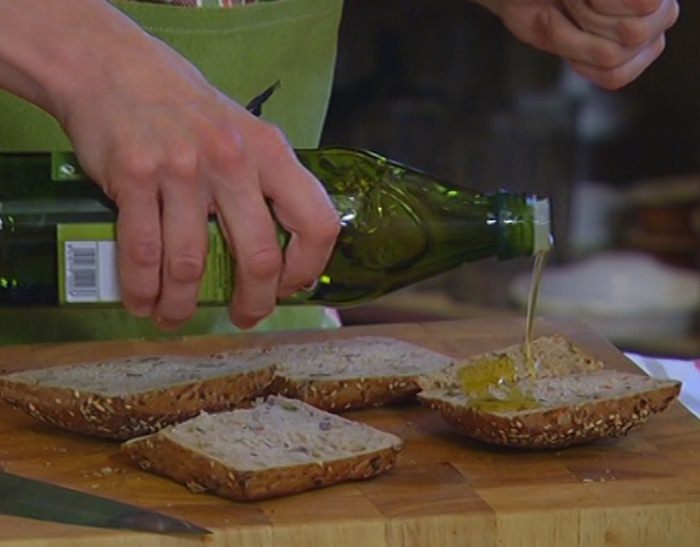 Булочки разрезать вдоль пополам и сбрызнуть половиной оливкового масла.