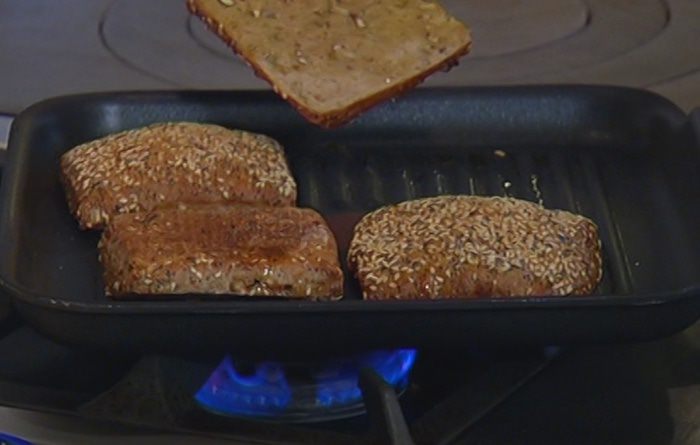 Разогреть сковороду-гриль и обжарить половинки булочек.