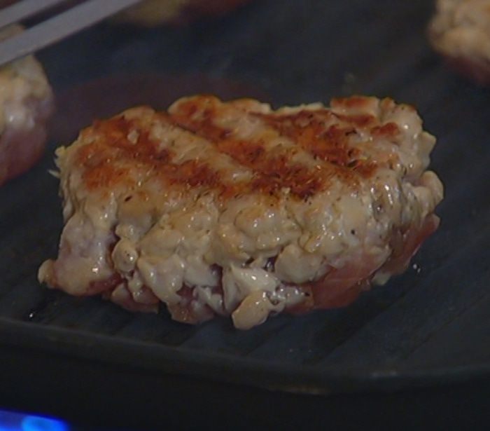 Хлеб переложить на тарелку, а на сковороду-гриль выложить котлетки, сбрызнуть оставшимся оливковым маслом и обжарить с двух сторон до готовности.