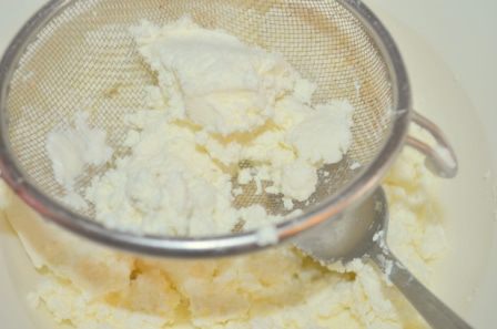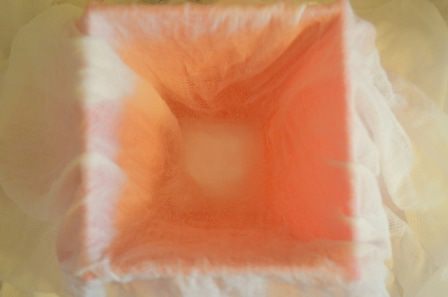 Подготовить форму для пасхи - выложить в нее влажную марлю, прижать к стенкам. Выложить в нее всю нашу массу, плотно прижимая. Свисающими краями накрыть массу, сверху положить тарелку или доску поставить гнет... что-то тяжелое! Саму форму с пасхой тоже ставим в глубокую тарелку, т. к. в процессе стояния с нее будет стекать жидкость, которую я сливала. убрать на ночь или даже больше.
