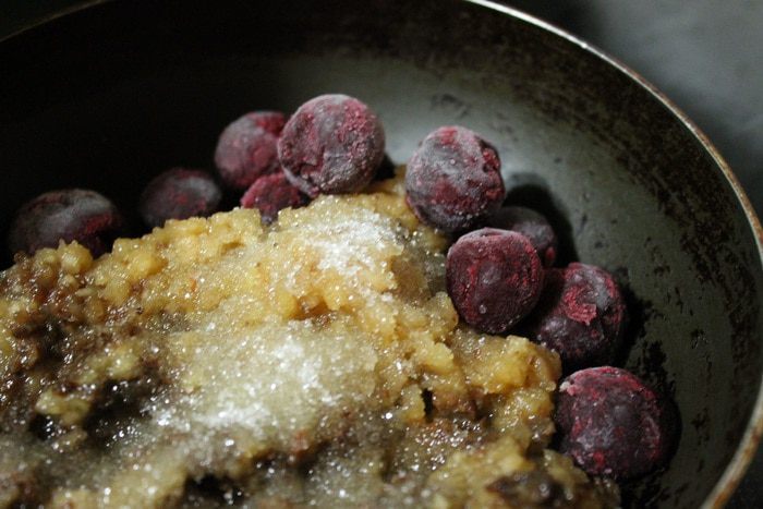 Натретий раскатанный пласт выкладываем начинку из вишни и яблока.