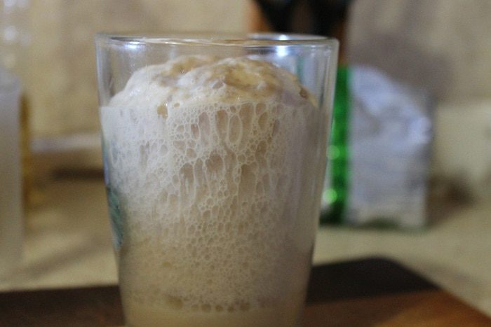 Переливаем содержимое стакана в глубокую миску, добавляем 200 мл теплого молока и понемногу начинаем добавлять просеянную муку, до тех пор пока тесто не приобретет текстуру, как на оладьи. Это опара. Накрываем миску полотенцем и оставляем на 1 час.