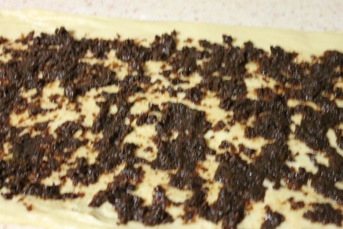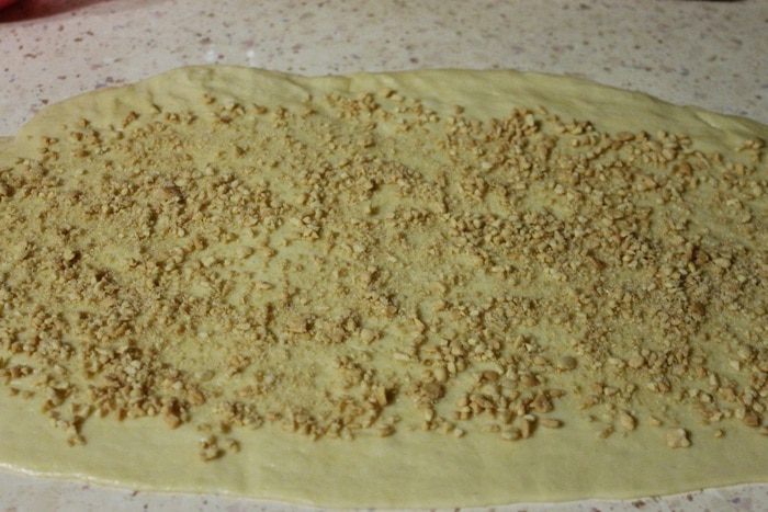 Далее тесто делим на 4 равные части. Раскатываем одну часть в прямоугольник 15х60 см, равномерно распределяем ореховую начинку, скручиваем рулетом защипав в конце края.