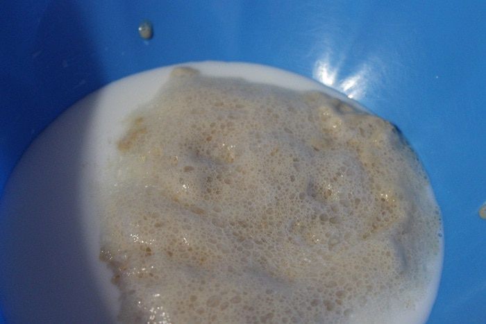 В стакан наливаем слегка теплую воду, добавляем дрожжи и 1 ч.л. сахара. И оставляем на 30 минут.