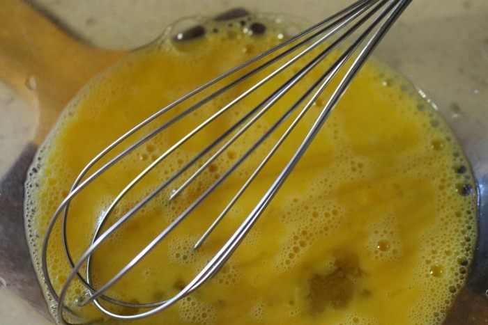 Пока опара отдыхает, берем еще одну глубокую миску, вбиваем туда 3 яйца, перемешиваем их венчиком, добавляем оставшееся молоко, соль, сахар и растопленное сливочное масло. Перемешиваем все до однородности.