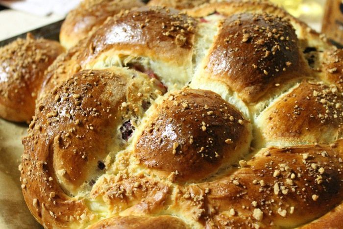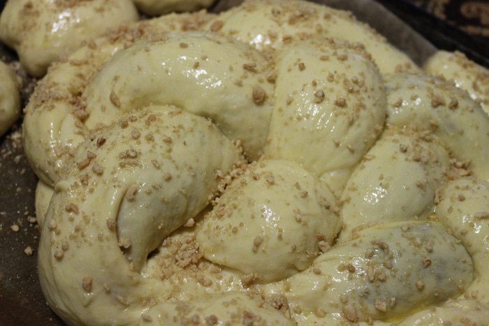 Из полученных рулетов плетем косичку, а потом соединяем концы и получается круглый пирог. Оставляем наш пирог на расстойку, на 15-20 минут. Из оставшегося теста, я сделала просто булочки. Затем верх пирога смазываем взбитым яйцом, посыпаем орешками и отправляем в духовку на 20 минут при температуре 200 градусов. А потом понижаем температуру до 180 градусов и печем еще 25 мину-30 минут.