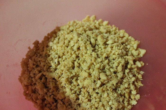 У меня был соленый арахис, высыпать его в комбайн, добавить сахар и корицу. Перемолоть в крупную крошку.