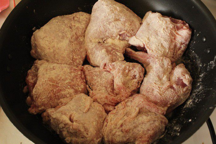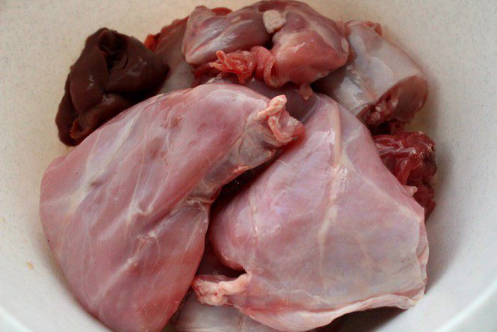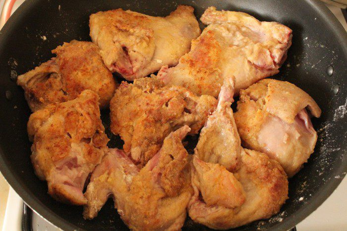 Растопить сливочное масло, добавить к нему оливковое масло. Куски кролика хорошо обвалять в муке со специями и обжарить на среднем огне в масле до золотистой корочки.