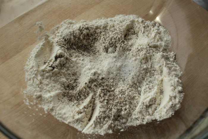 Смешать в чашке муку, соль и перец.