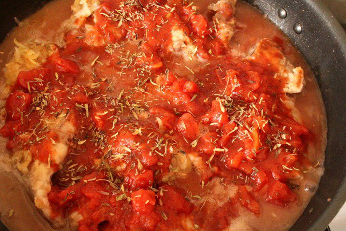 Влить вино, увеличить огонь до максимума и дать вину выпариться на 1/3. Затем добавить рубленные томаты вместе с соком, посыпать молотым орегано, приправить солью и перцем.