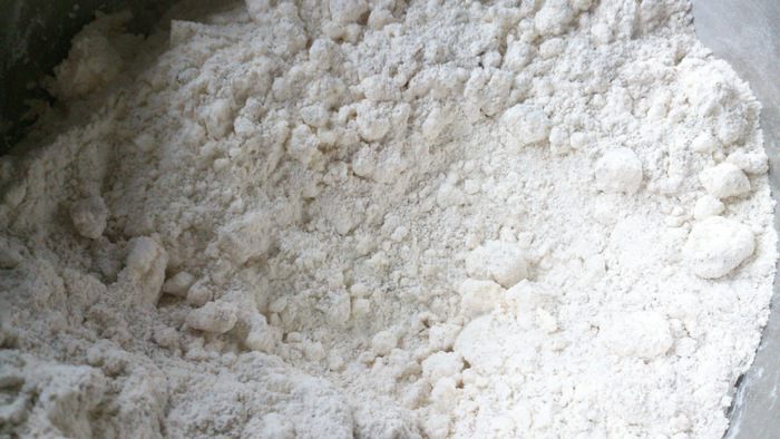 В миску просеять оба вида муки, соль, добавить творог. Хорошо перемешать.