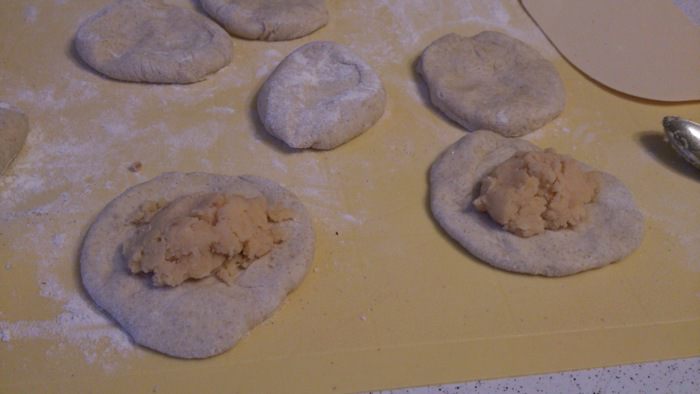 Разделить тесто на небольшие шарики, раскатать их в лепешки и выложить начинку.