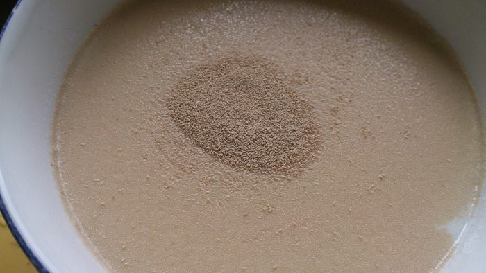Смешать воду и молоко. Всыпать дрожжи, сахар и размешать
