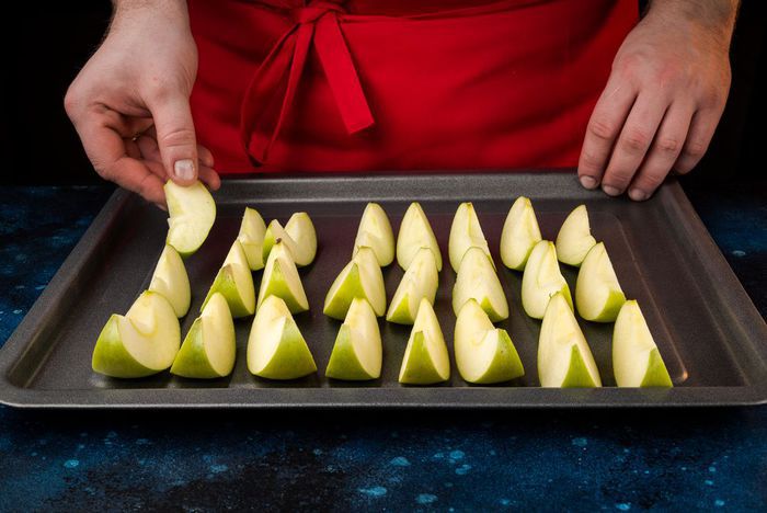 Приготовьте яблочное пюре. Яблоки разрежьте пополам, уберите сердцевину. Запекайте 30-35 минут.