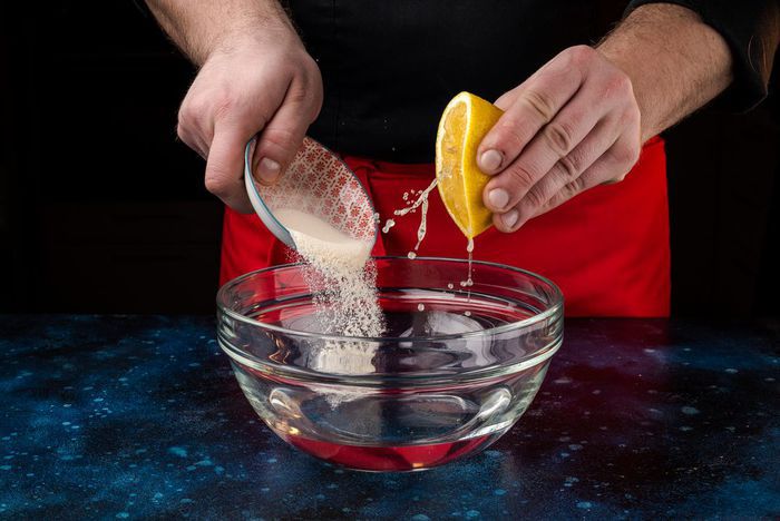 Тем временем приготовьте сироп из агар-агара. Смешайте воду, лимонный сок и агар-агар. Полученную смесь отставляем.