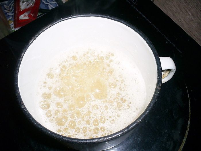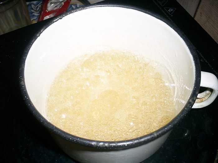 Если у вас есть термометр, увариваем сироп до 120 градусов, если нет - капля сиропа, если ее капнуть на выпуклую сторону холодной столовой ложки, должна держать форму и не расплываться. Сироп кипит медленно, пузырьки маленькие. Теперь высыпаем в сироп лимонную кислоту и энергично размешайте. Если у вас есть агар-агар, добавляем и его и размешиваем 15 секунд. Сироп начнет сильно пениться, но быстро успокоится.