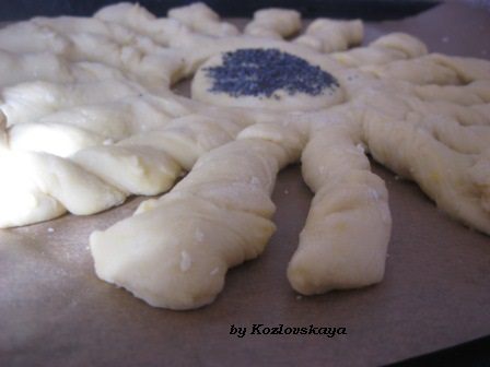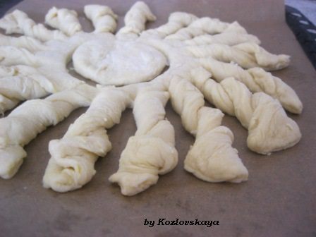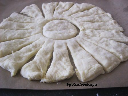 И так, с каждой частью теста. у меня получилось 2 " подсолнуха" и с третьей части я сделала рулет.