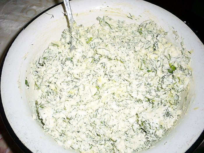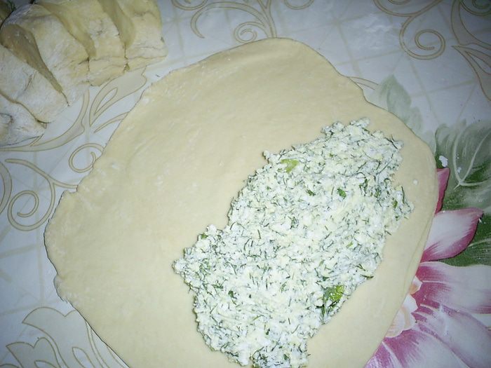 Взбиваем вилкой яйцо с солью, добавляем простоквашу, размешиваем. Всыпаем стакан муки и добавляем соду. Затем добавляем оставшуюся муку. Если простокваша была очень жидкой и тесто липнет к рукам, можно добавить еще немного муки. Оставляем тесто на полчаса отдохнуть в теплом месте.