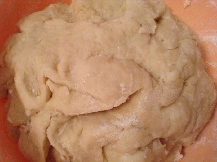 Влить растительное масло, муку, все перемешать, замесить мягкое тесто.
