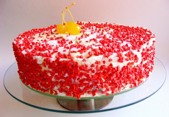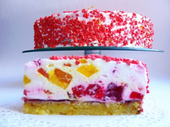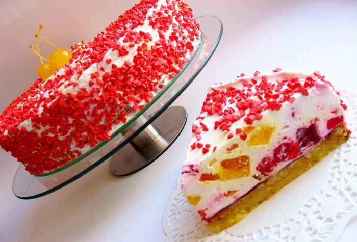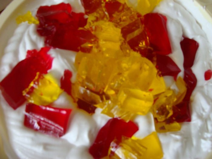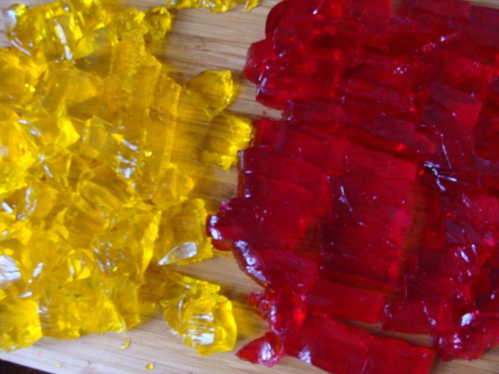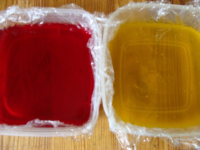 Развести 20 г желатина в 200 г воды, дать набухнуть. Добавить оставшуюся воду и сахарный песок, поставить на медленный огонь. Постоянно помешивать до полного растворения, до кипения не доводить. Снять с огня, добавить ванилин, остудить до комнатной температуры. Разлить желатин в две баночки, в одну добавить красный краситель, в другую желтый. Формы выложить пищевой пленкой и разлить желатин. Поставить в холодильник до полного застывания, лучше на ночь.