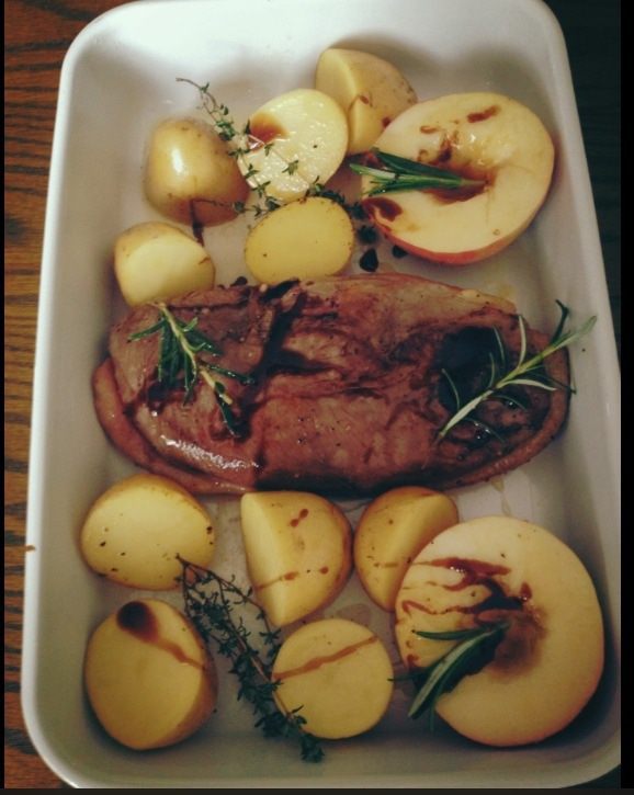 Яблоки и картошку сложить к утиному филе в жаропрочную посуду, а также травы прованса и раздавленные дольки чеснока. Сверху все полить медом и бальзамическим соусом.