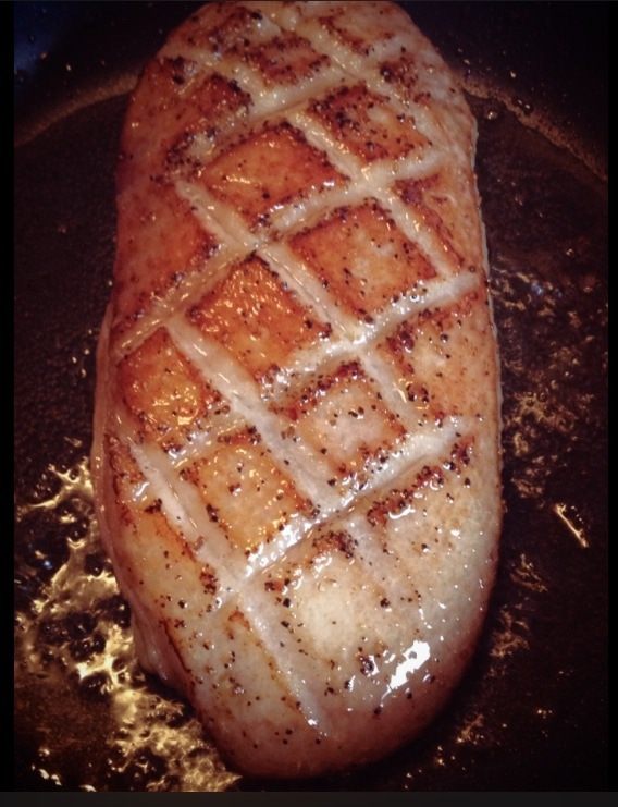 В это время ... Надрезать утиное филе со стороны шкурки, аккуратно не повредив самого маско. Посолить , поперчить и обжарить на сковороде до золотистой корочки со всех сторон. Переложить в жаропрочную посуду.