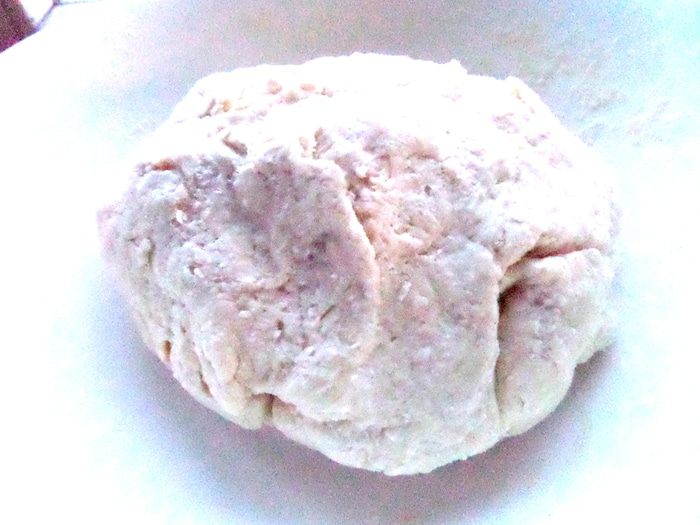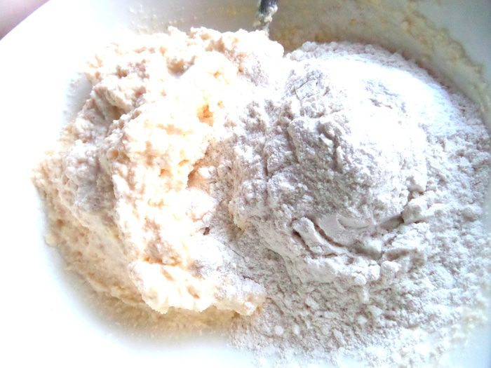 Добавить соль,разрыхлитель и муку. Рикотта сладковатая,поэтому сахар не добавляла.