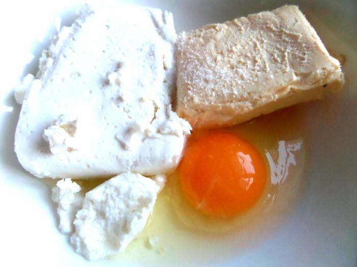 Соединить нежный творог,мягкое масло и яйцо крупное.
