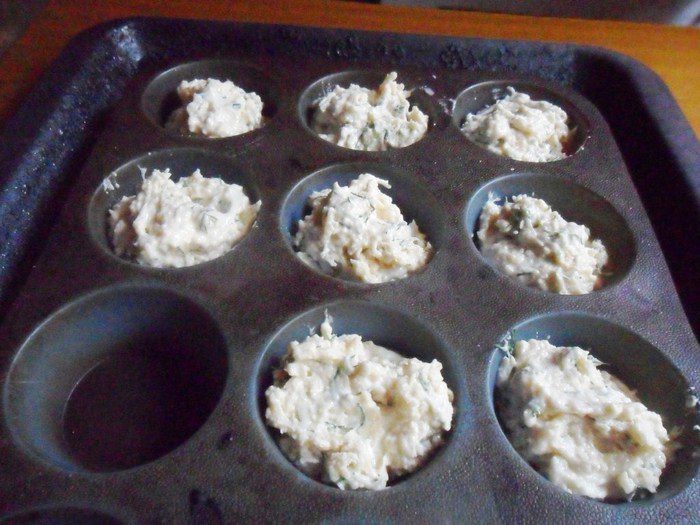 Тесто выложить в формочки для маффинов, заполняя их на 2/3. Поставить в разогретую до 180С духовку.