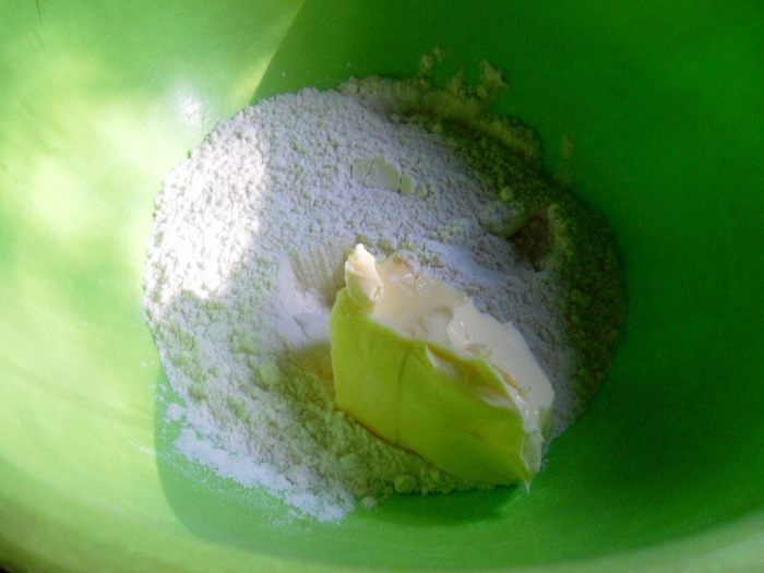 Просеять муку с разрыхлителем и солью. Порезать сливочное масло. Добавить к муке. Перетереть с мукой масло в крошку.