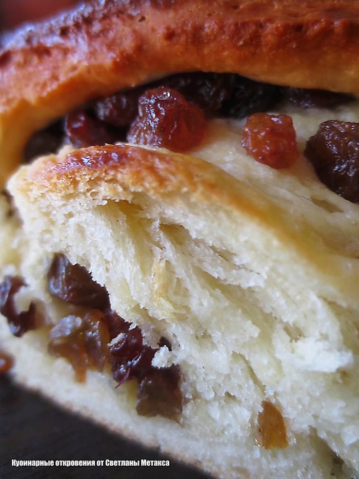Из теста раскатываем 2 лепешки. На нижнюю лепешку выкладываем начинку ( изюм с сахаром),накрываем второй лепешкой, концы залепляем. Переворачиваем швом вниз и затем делаем продольный разрез и аккуратно, придерживая пальцами, перекручиваем две части между собой. Смазываем взбитым желтком, оставляем на полчаса увеличиться в размере. Я выпекала в форме кирпичик.
