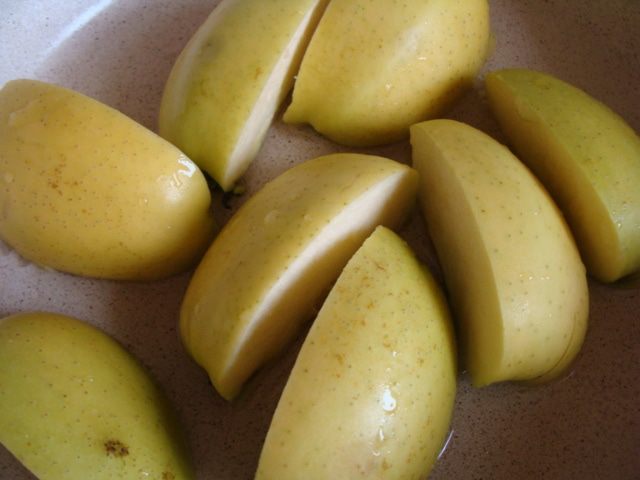 Пока охлаждаются сливки, яблоки освобождаем от косточек и пассируем на сковороде минут 7.