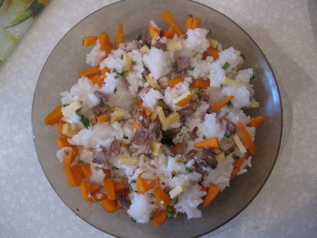 Говядину, рис, тыкву, лук зеленый и сыр перемешиваем.