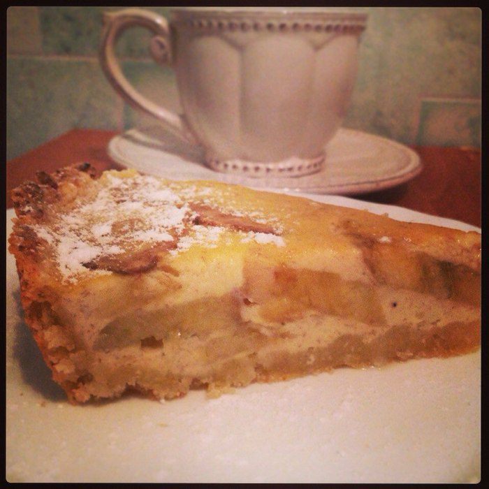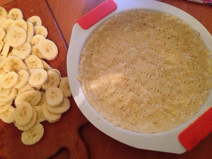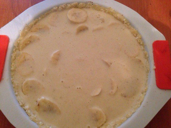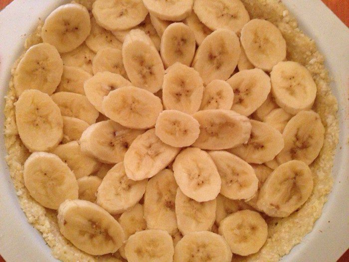 Готовим заливку: спелый банан пюрируем блендером, добавляем яйца, сливки, сахарную пудру (пудру можно и не добавлять, так как пирог и так получается довольно сладенький), крахмал и все хорошенько взбиваем. Бананы для начинки нарезаем кружочками. Достаем из морозилки тесто и выкладываем на него бананы.