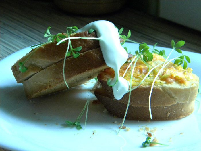 перемешиваем хорошо. Берём 2 куска хлеба,в одном кусочке вынимаем серединку и кладем сверху второго, получится типа корзинка, в неё накладываем нашу начинку. Так проделываем с остальным батоном и в духовку на 15 мин.