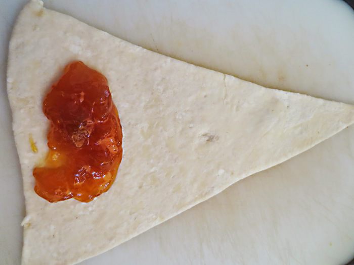 Готовое тесто разрезать на треугольники. С широкой стороны выложить начинку
