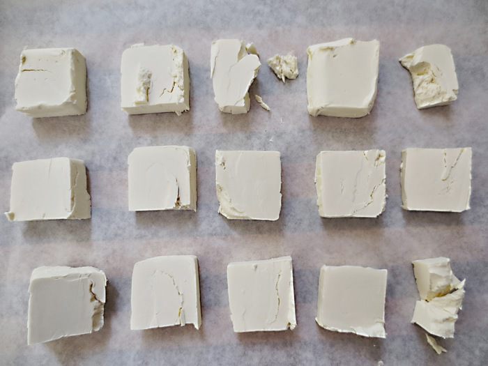 Масло разрезать на кусочки и выложить на бумагу для выпечки ( масло должно быть замороженным)